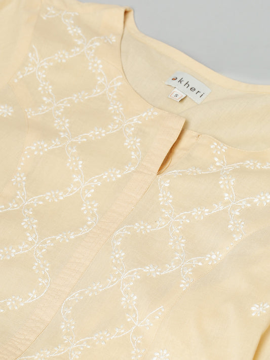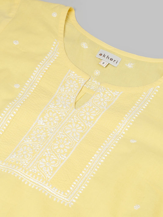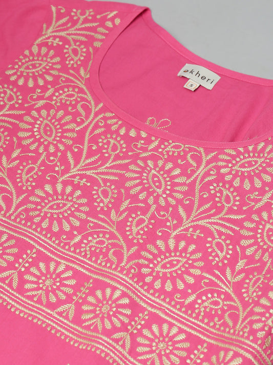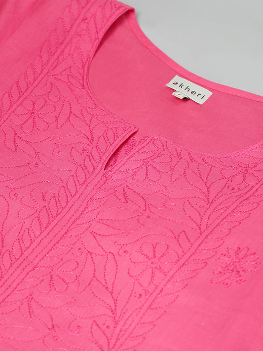 Pink Cotton Kurta Pot Neck Embroidered Kurta