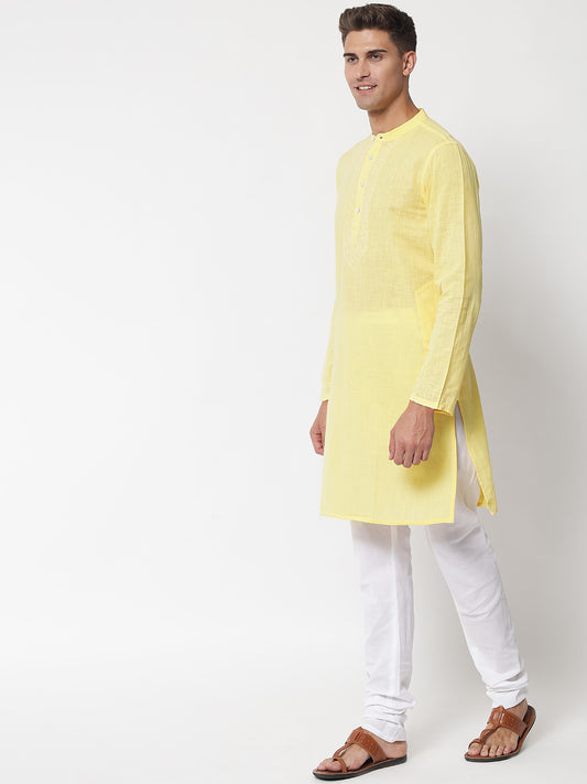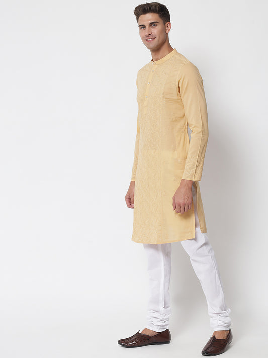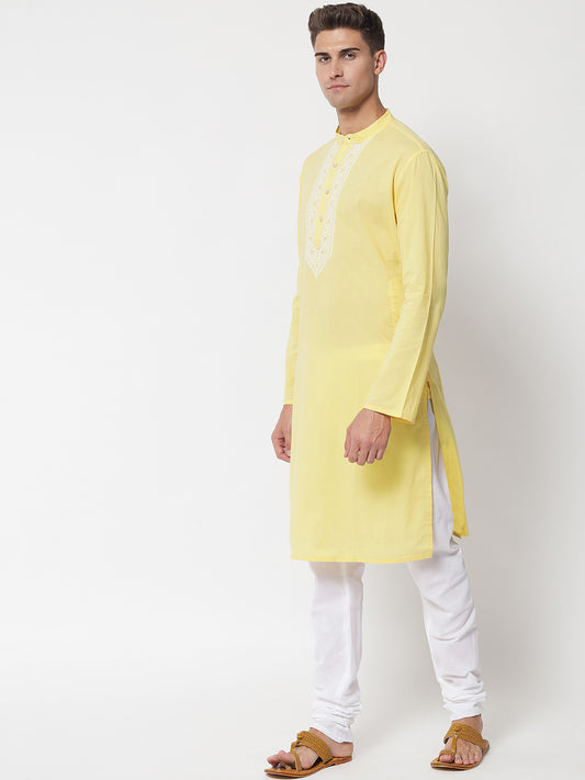 Men's Yellow Cotton Chikankari Hand-Embroidered Kurta