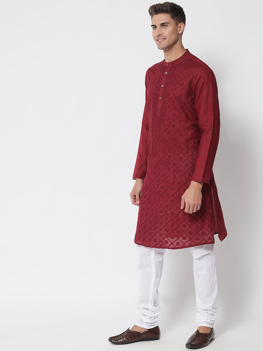 Maroon Cotton Hand-Embroidered Chikankari Kurta