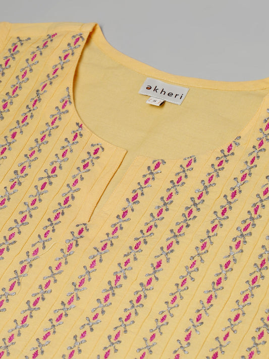 092 Yellow Pintucks Embroidered Kurta