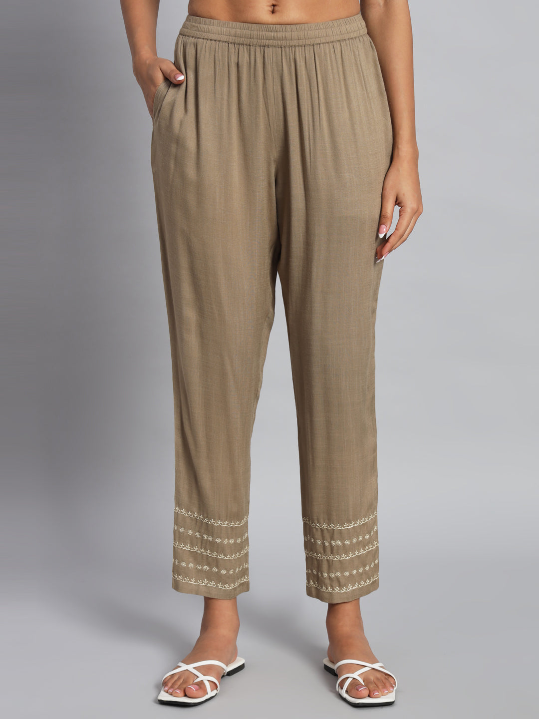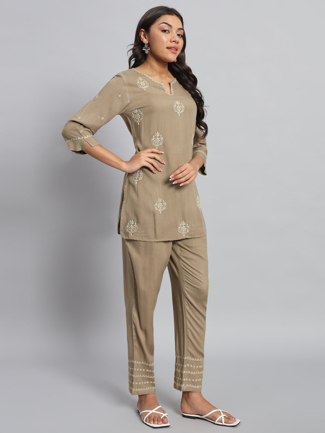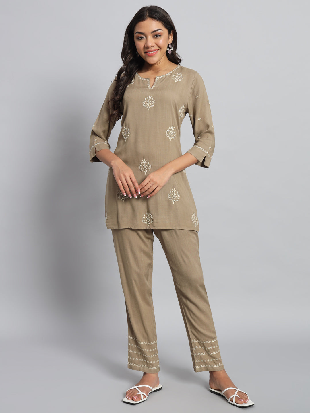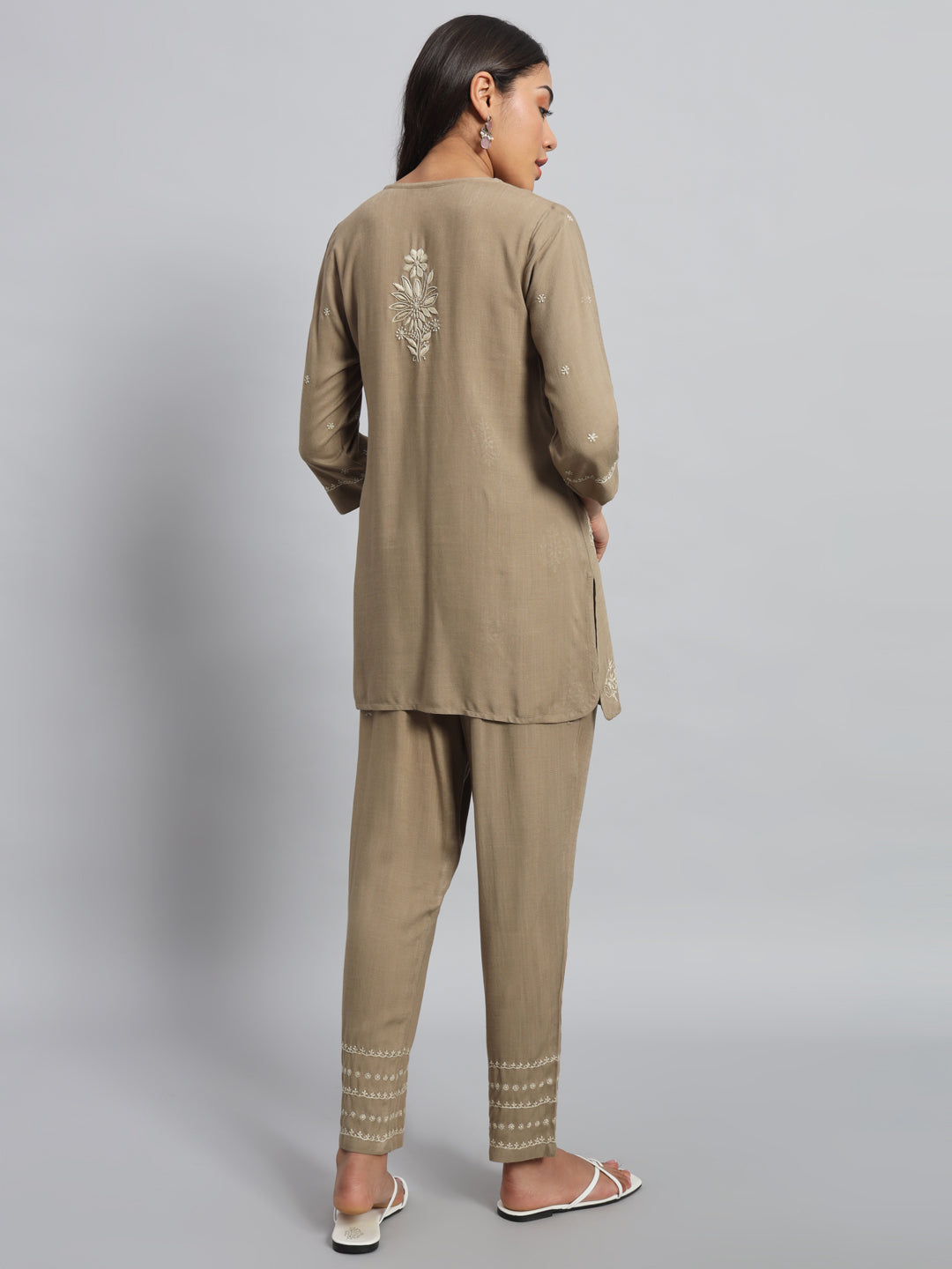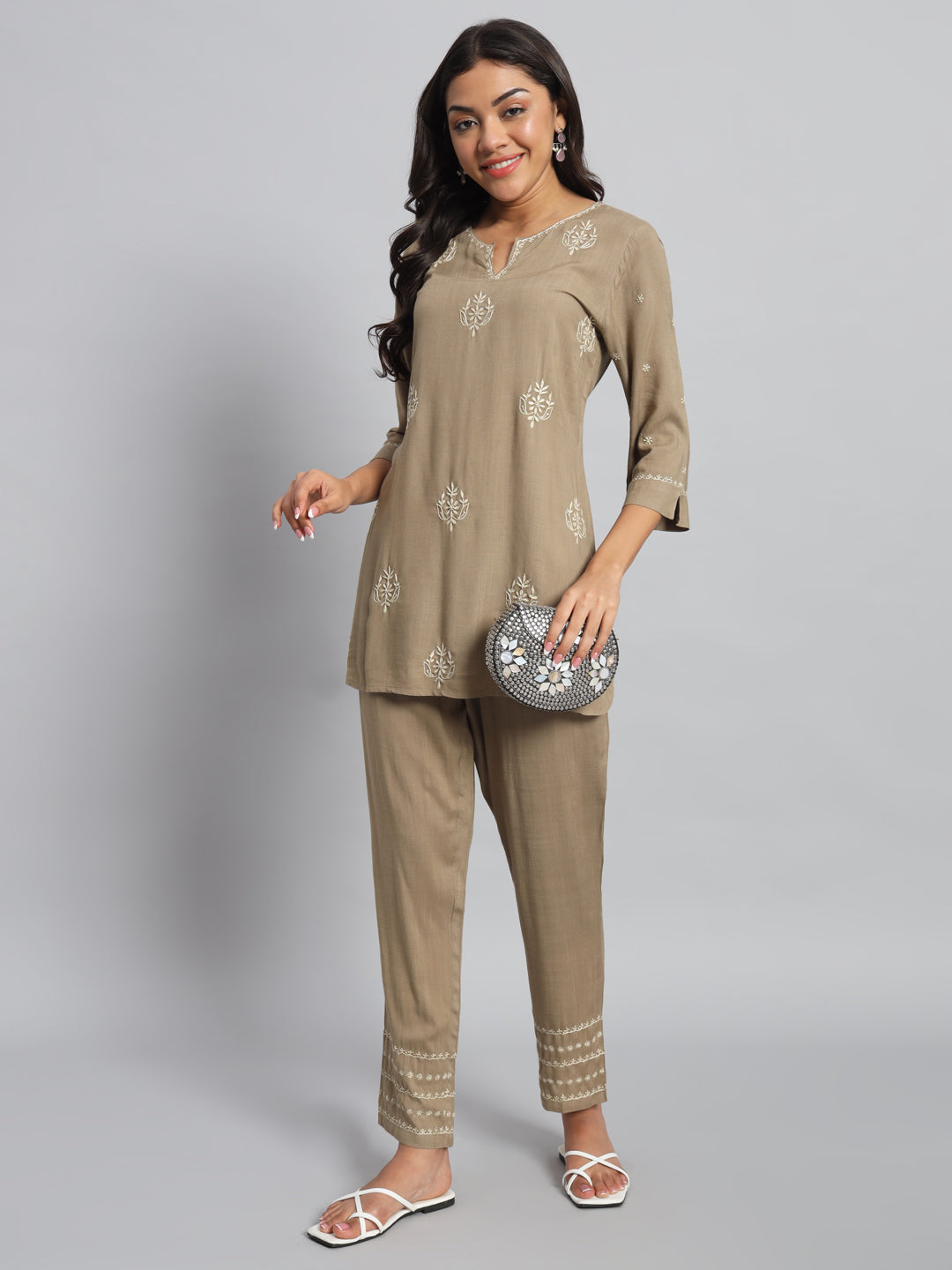 Introducing our exquisite Beige hand-embroidered Chikankari Kurta and Pant Set. The kurta boasts beautifully hand-embroidered floral motifs that are both traditional and contemporary, allowing you to embrace your heritage with a touch of sophistication. The pants, with an elasticated waist and matching embroidery details, provide the perfect balance to complete the look.