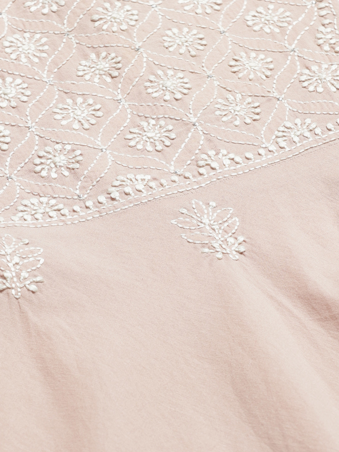 Dusty Pink and White chikankari embroidered A-line kurta, has a round neck, long sleeves, button closure, and curved flared hem