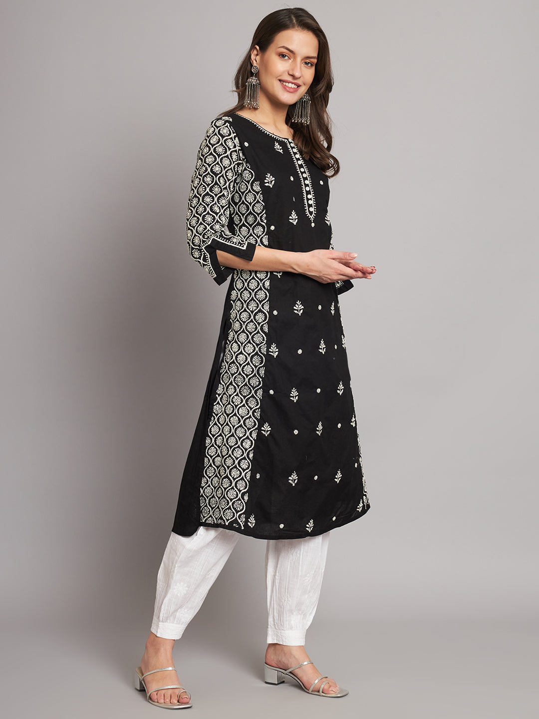 Introducing our stunning Black and White intricately hand-embroidered Chikankari kurta, beautifully combining with a classic monochrome elegance.The contrasting white threads intricately intertwining on black fabric create a striking visual impact.