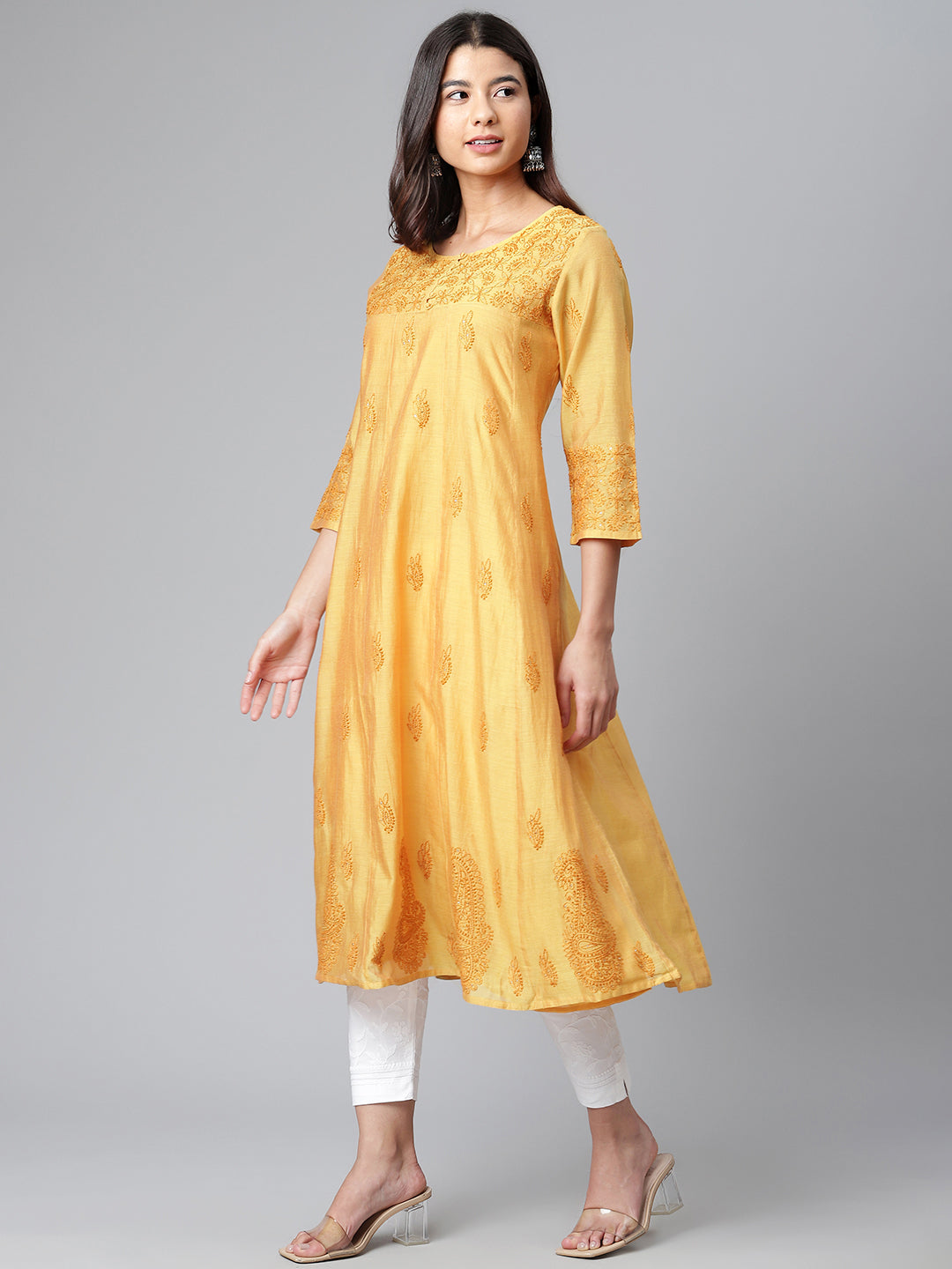 Colour: mustard yellow Ethnic motifs embroidered Boat neck Three-quarter, regular sleeves A-line shape with regular style Chikankari detail Calf length with flared hem Machine weave regular