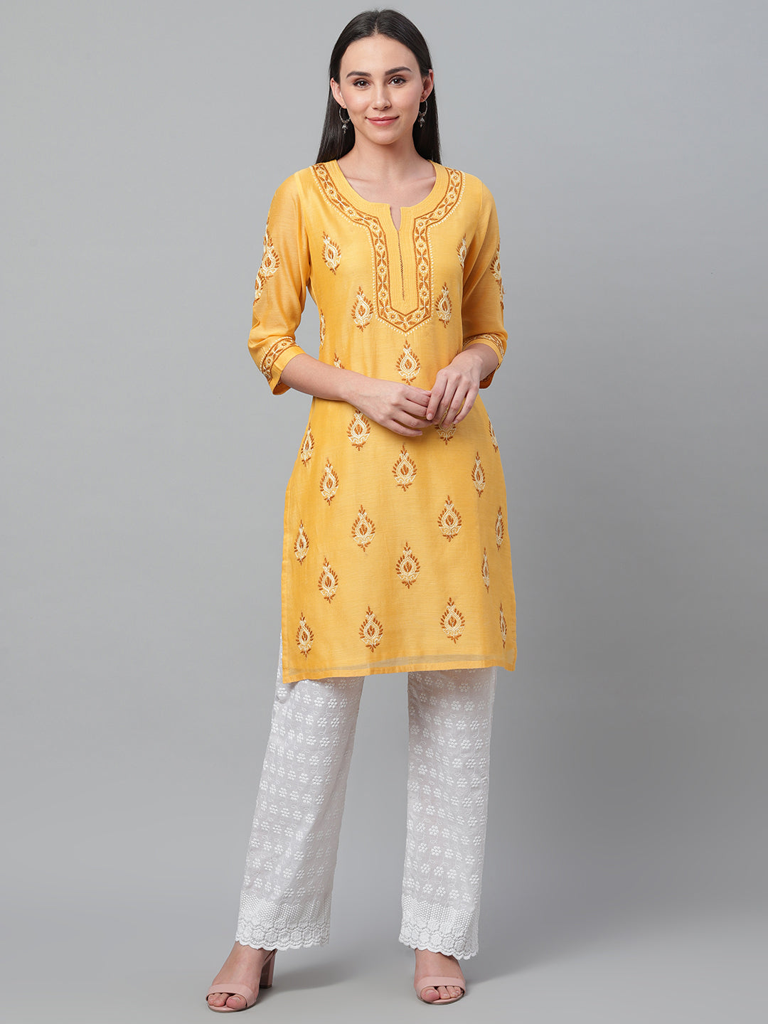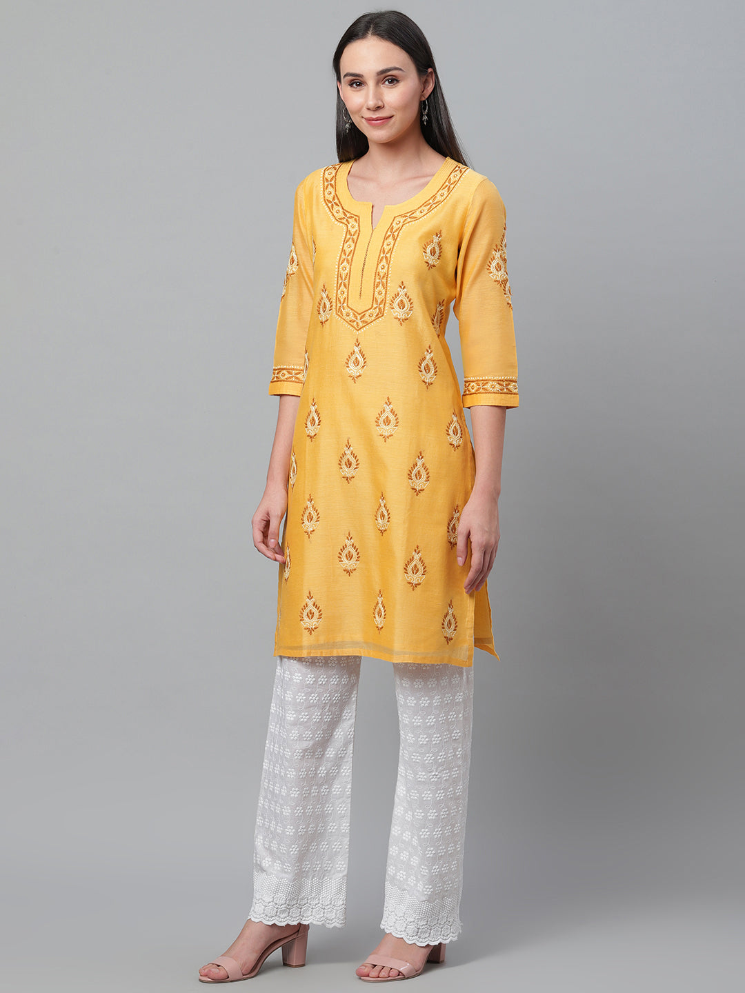 Yellow and Brown Chikankari embroidered straight kurta, has a notched round neck, three-quarter sleeves, straight hem, side slits and an attached lining