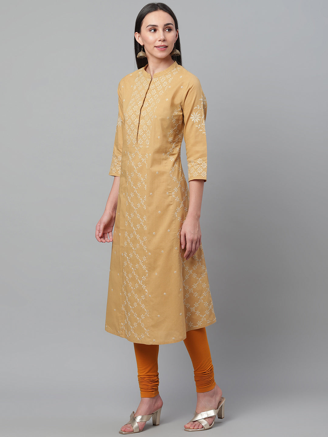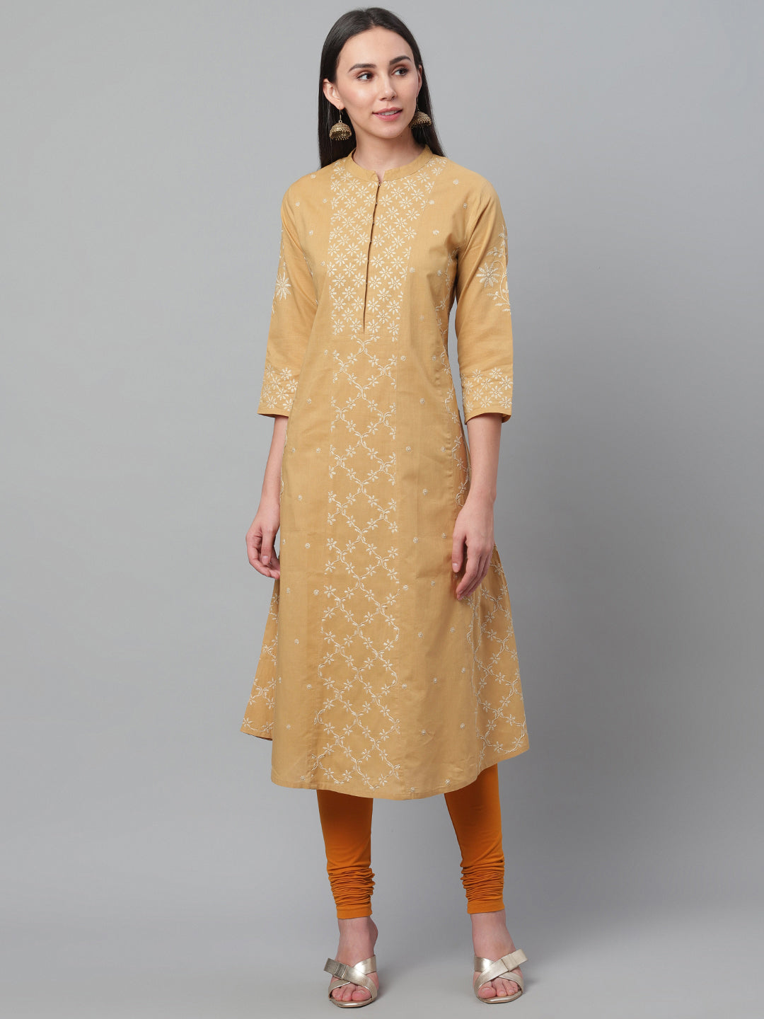 Beige and White A-Line Chikankari Kurta