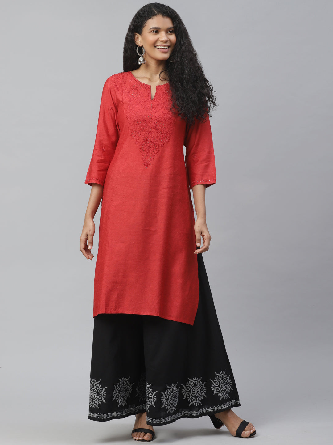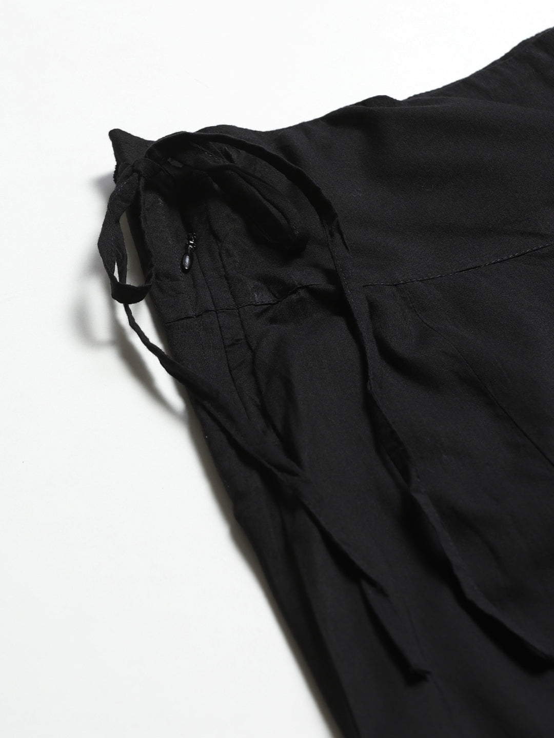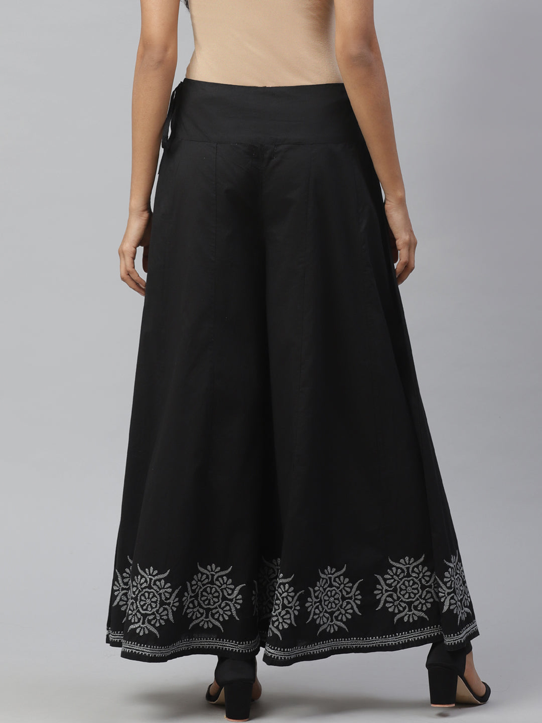 A pair of Black and Grey Chikankari embroidered hem design woven flared fit Palazzos, opaque, and drawstring and zip closure
