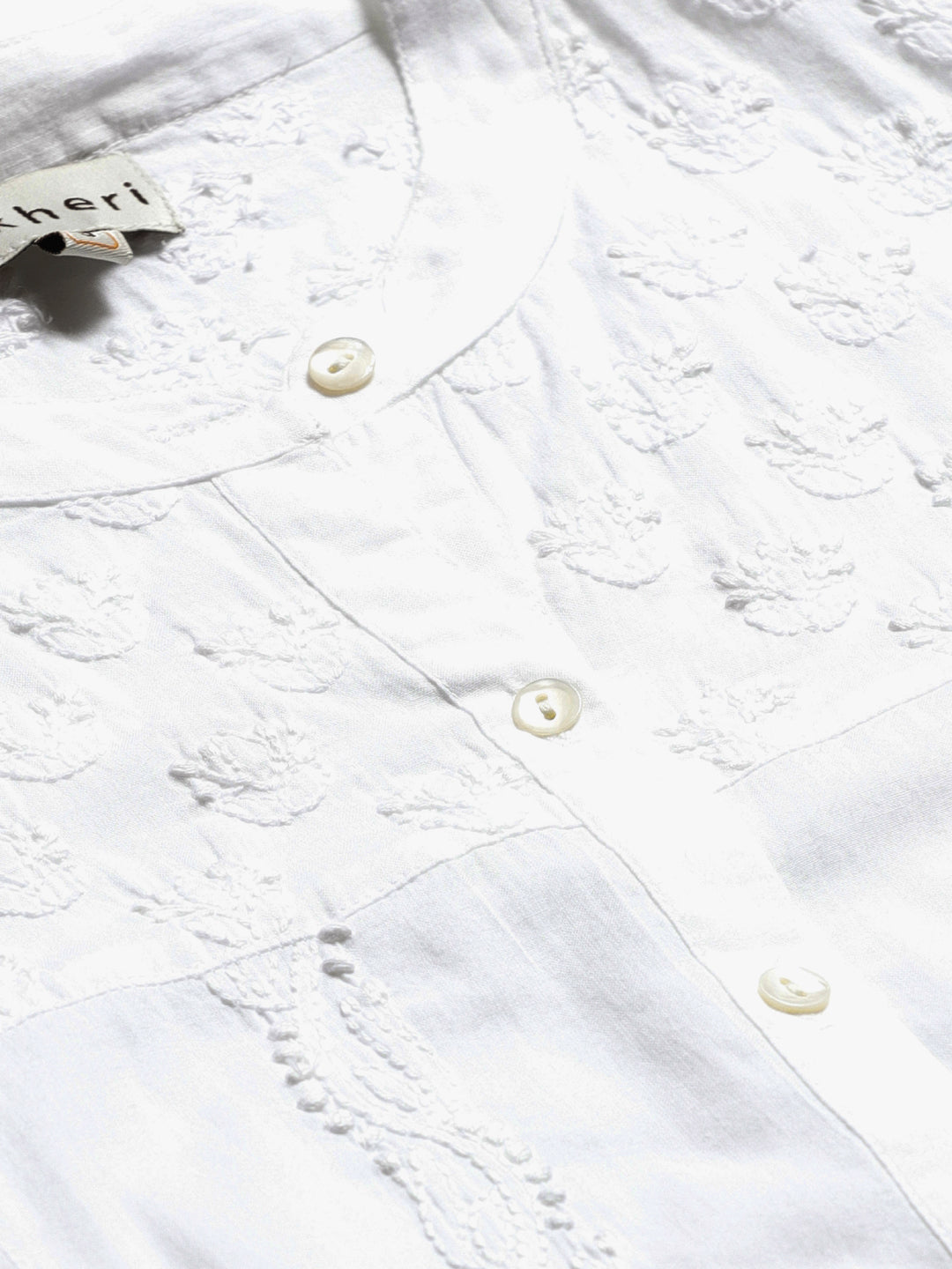 White chikankari embroidered detail casual shirt, has a mandarin collar, long sleeves, button placket, and curved hem