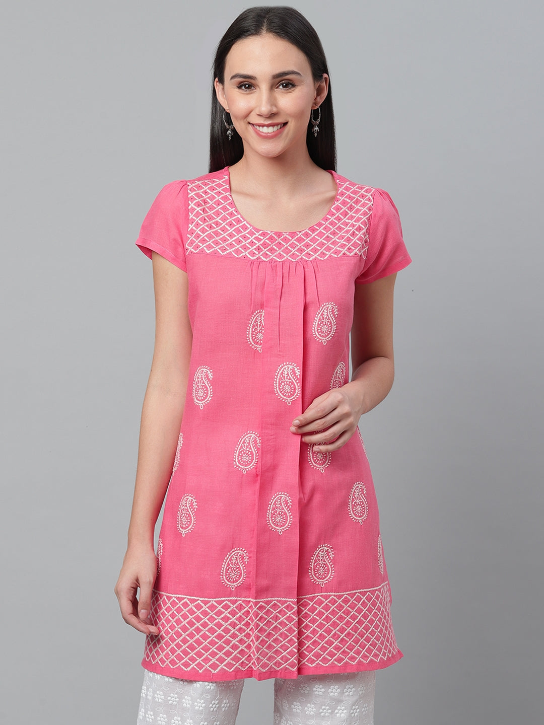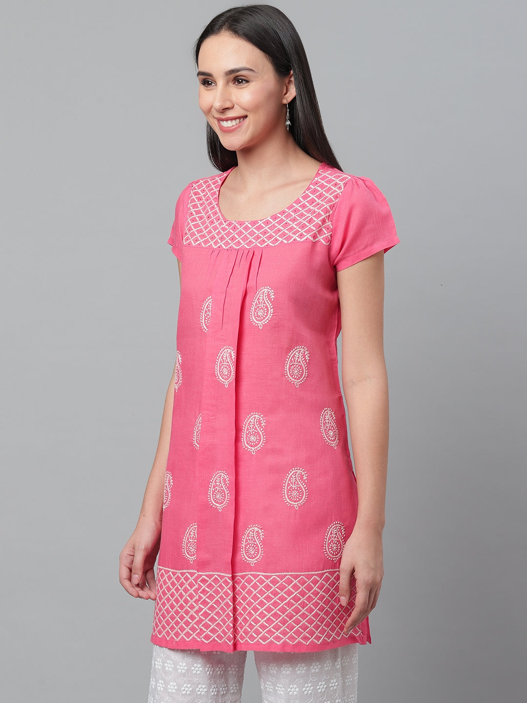 Pink and White Chikankari Embroidered straight kurta with mukaish work and pintuck detailing, has a round neck, short sleeves, straight hem, and side slits