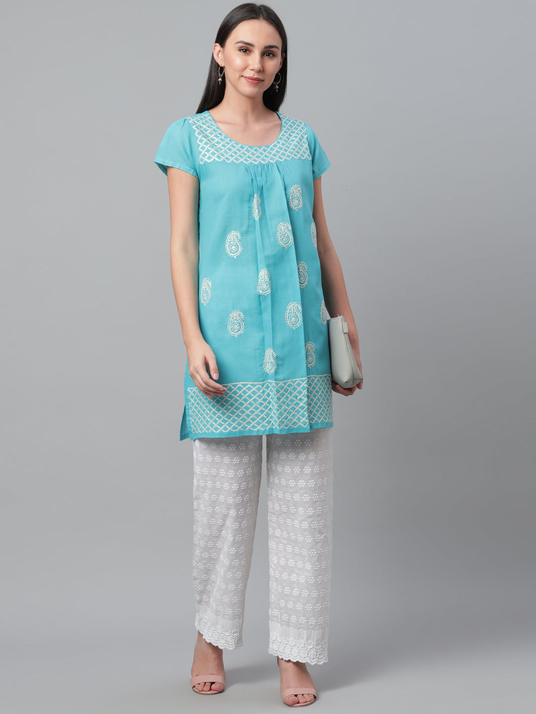 Blue and White chikankari embroidered pleated straight kurta, has a round neck, short sleeves, straight hem, and side slits