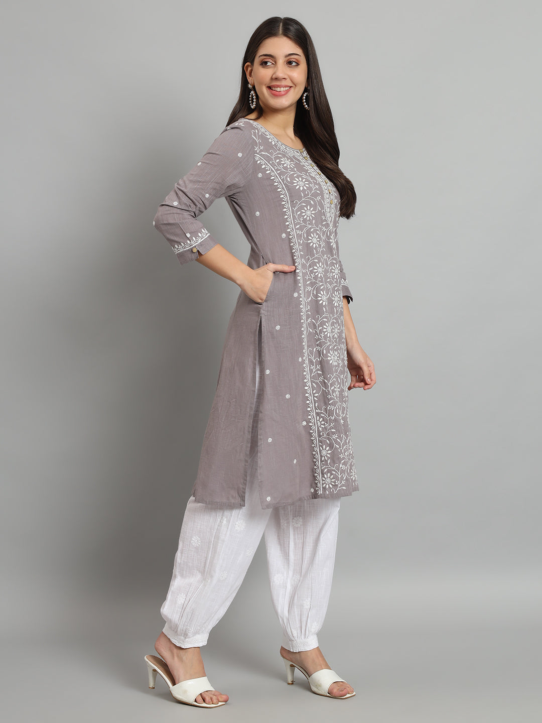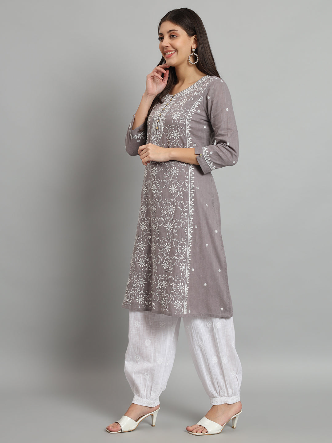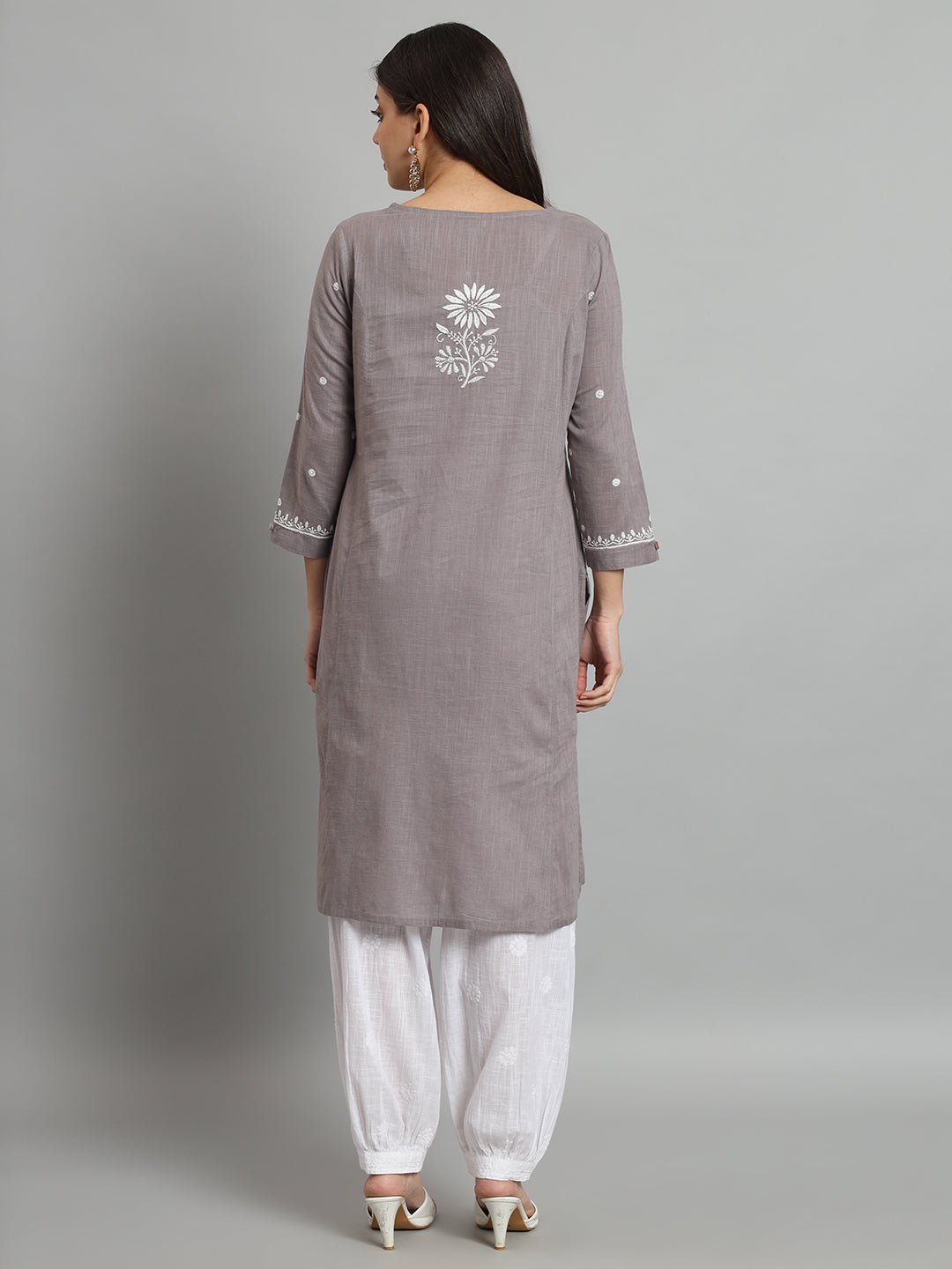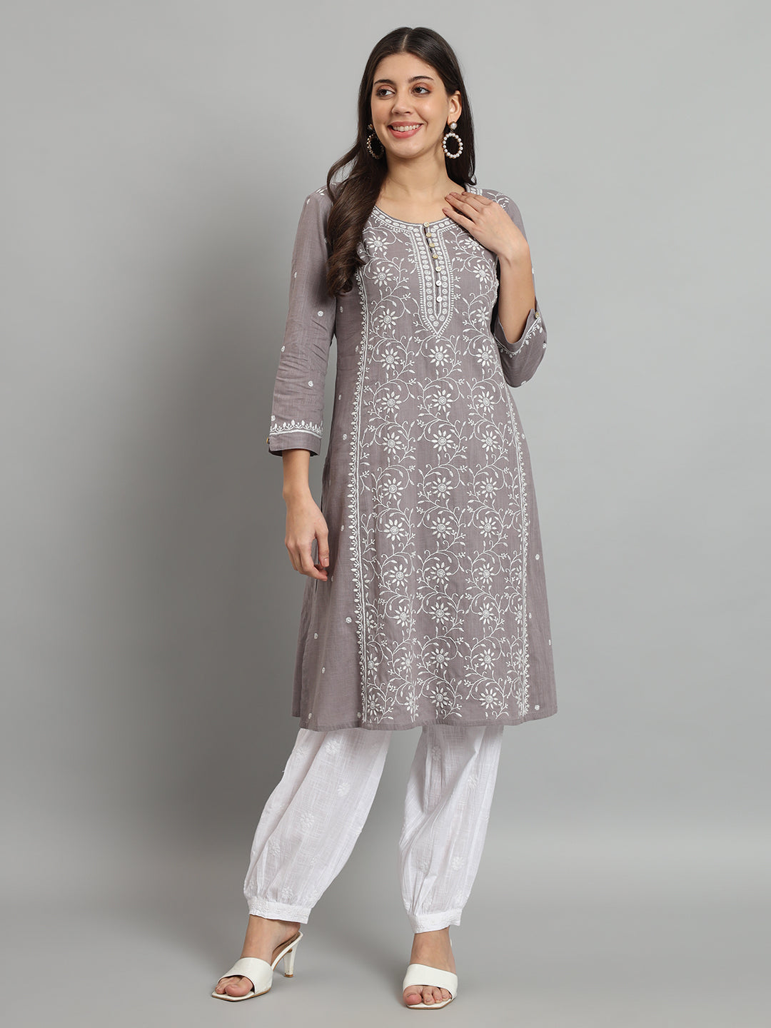 Grey Cotton Slub A-line Chikankari Kurta