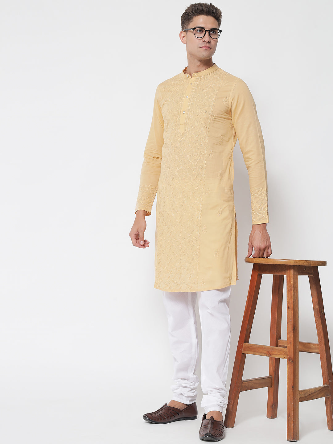 Men's Beige Chikankari Kurta with Central Panel Embroidery
