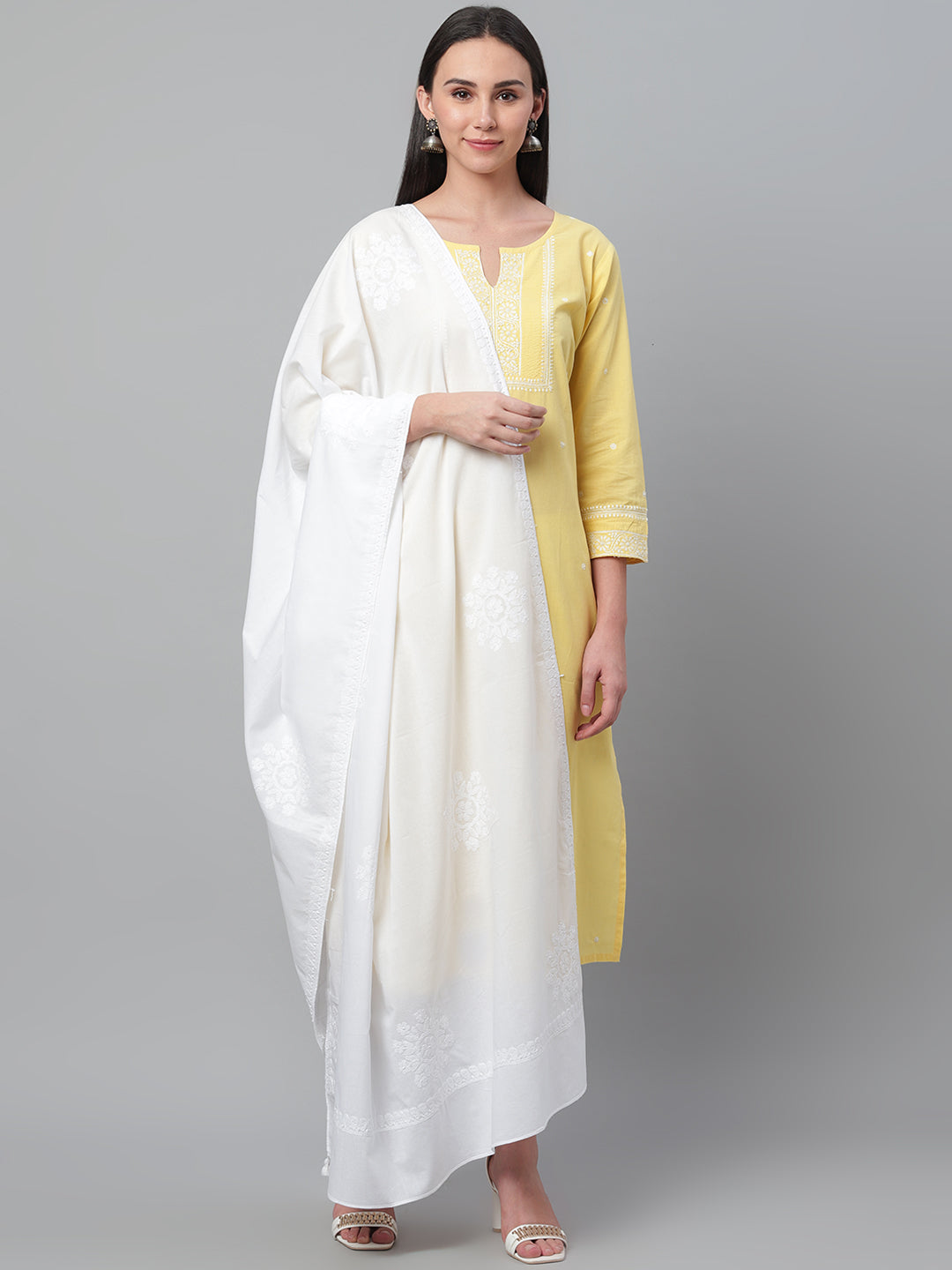 White Chikankari embroidered Dupatta, and has tasselled corners