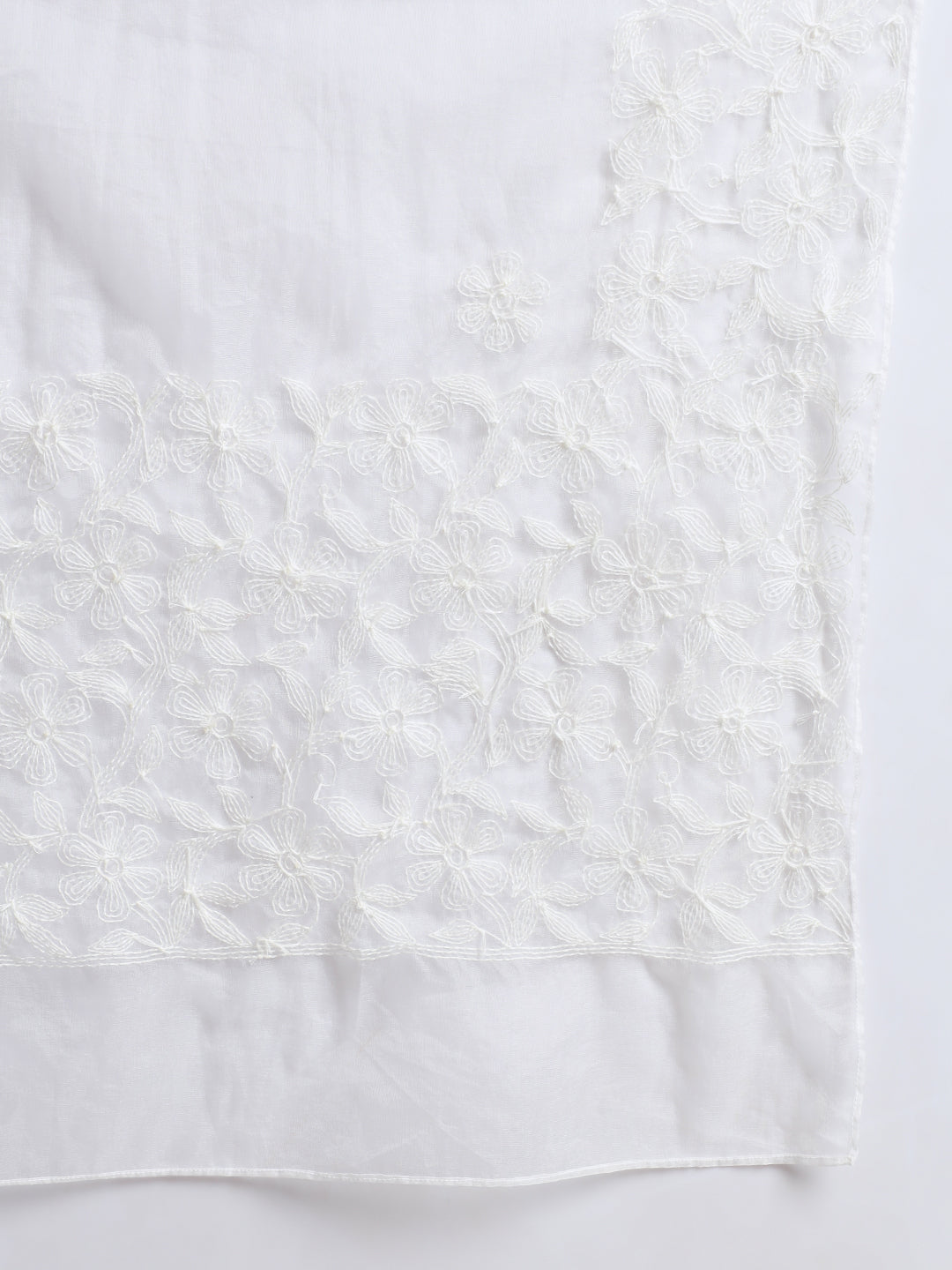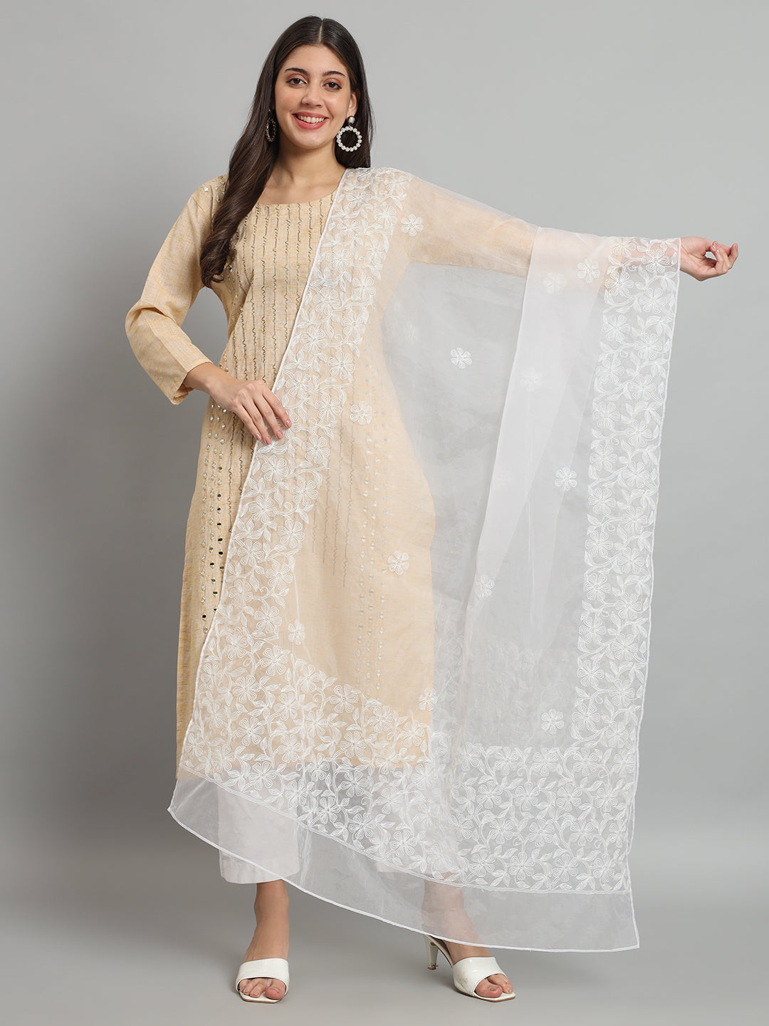 Crafted from fine organza, this dupatta boasts a delicate, sheer texture that drapes beautifully. The intricate white Chikankari embroidery on the sheer organza fabric offers a contemporary take on the classic Chikankari, making it a versatile addition to your wardrobe.