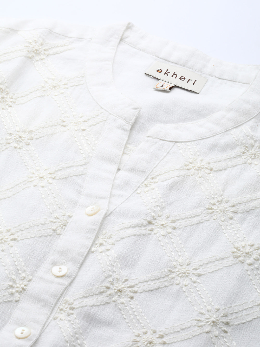 White floral self design opaque Casual shirt ,has a mandarin collar, button placket, three-quarter regular sleeves, curved hem