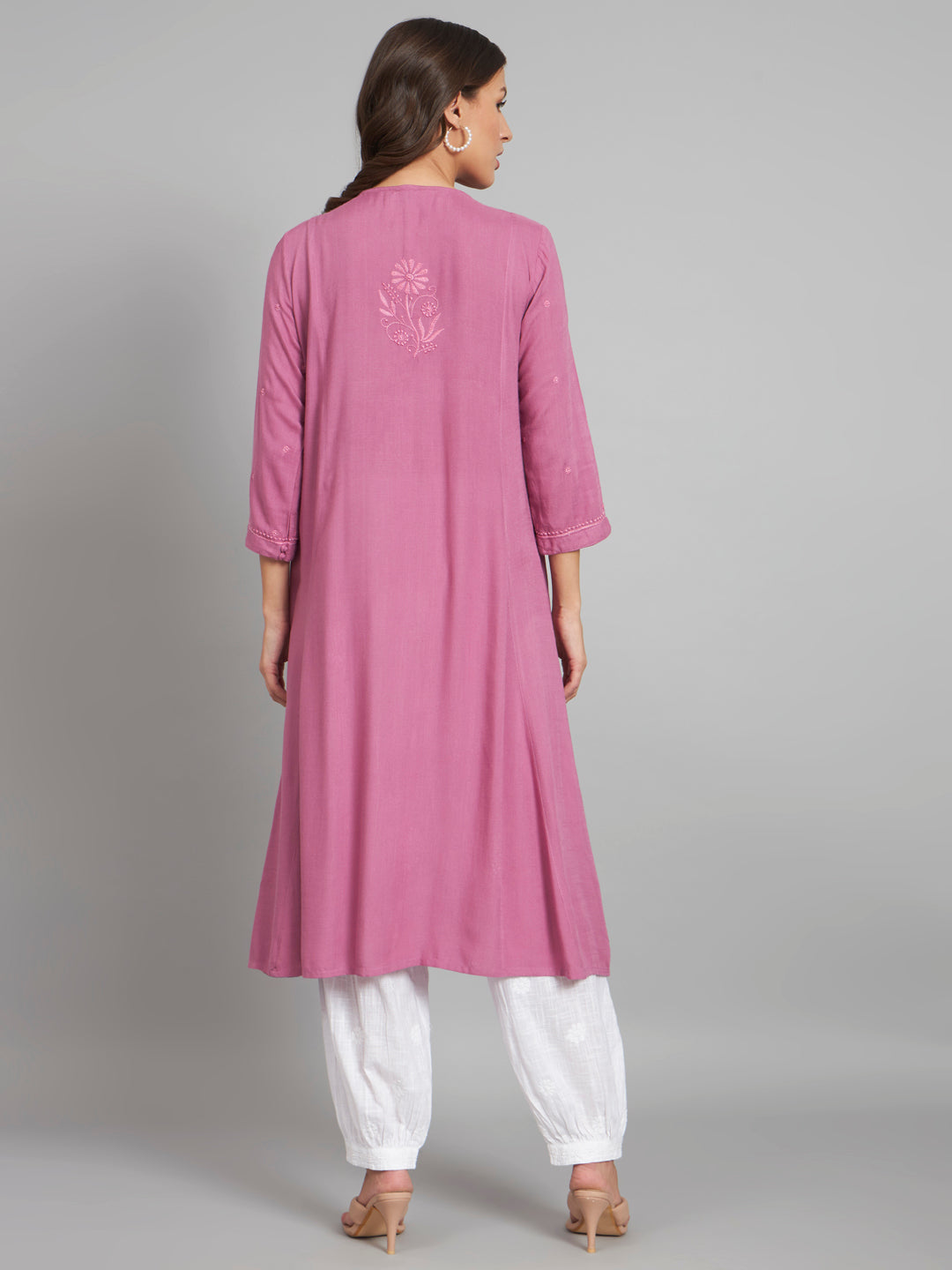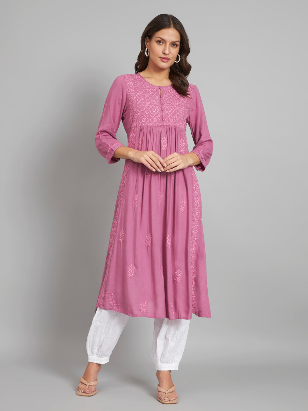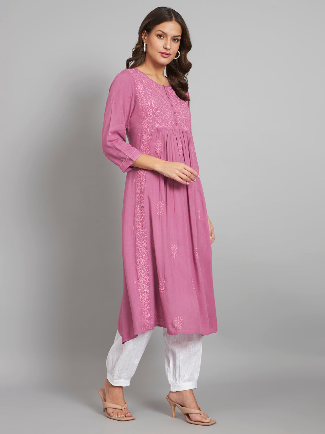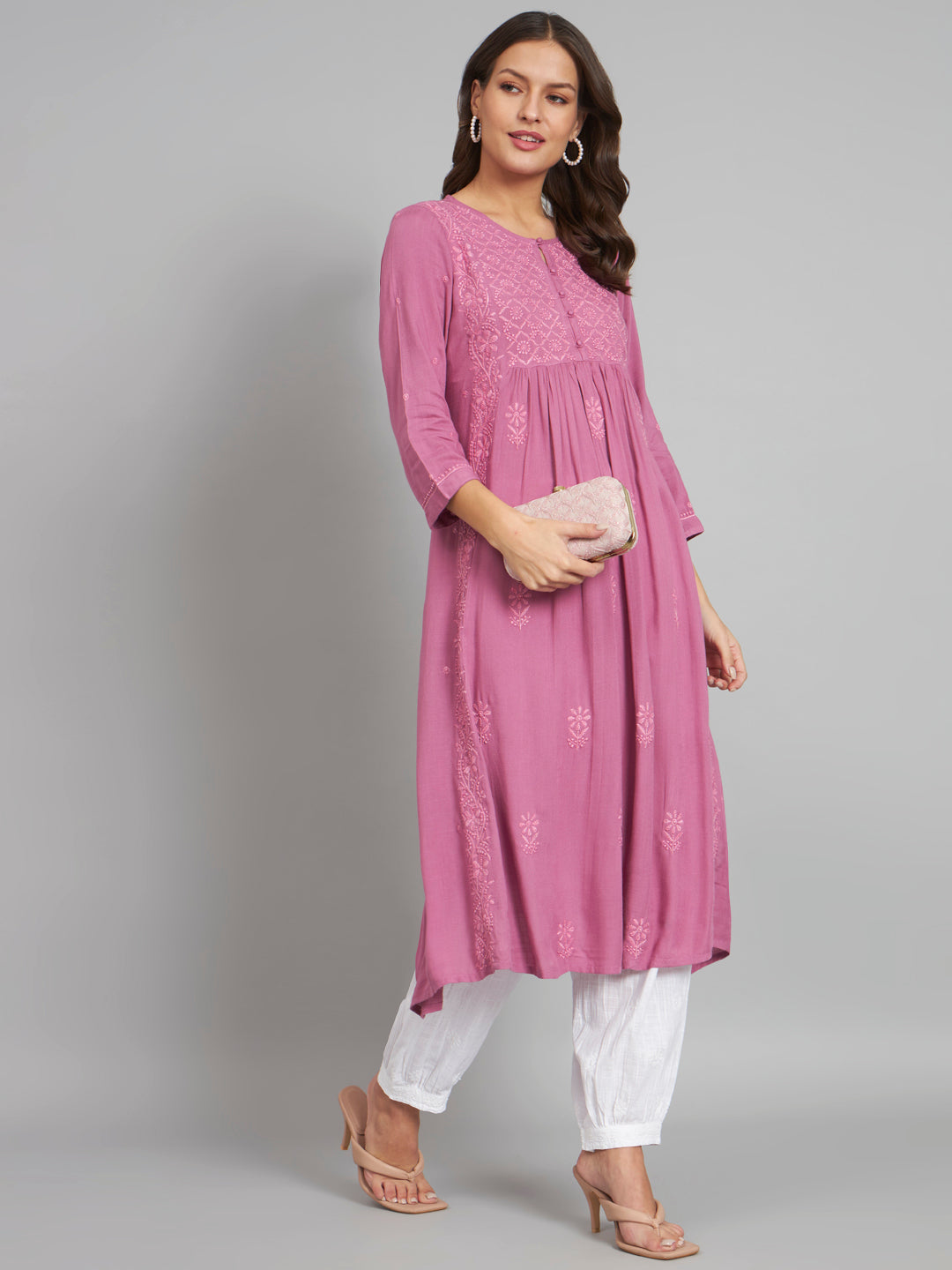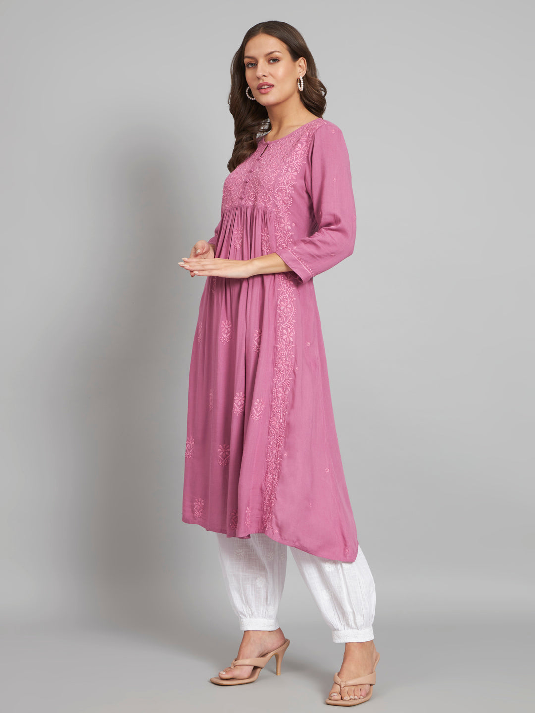 Onion Pink Flared Chikankari Kurta
