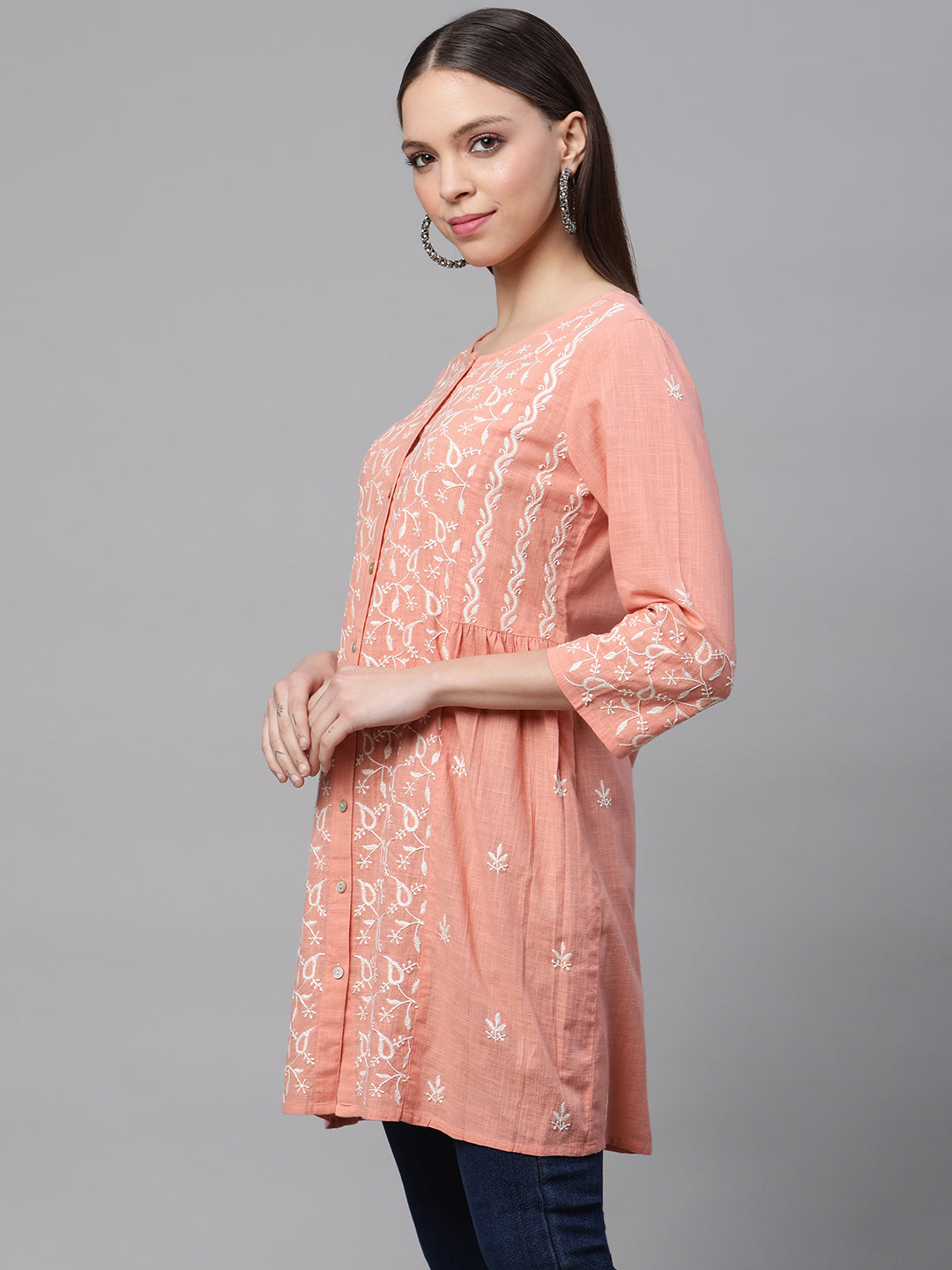 Introducing our exquisite Peach Cotton hand-embroidered Chikankari Tunic. The tunic boasts beautifully hand-embroidered floral motifs that are both traditional and contemporary, allowing you to embrace your heritage with a touch of sophistication.