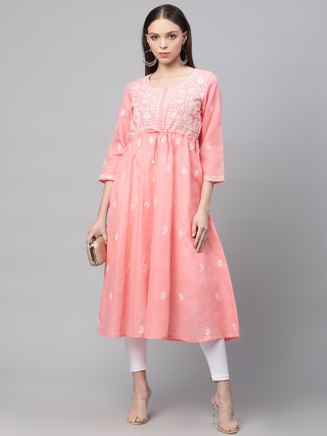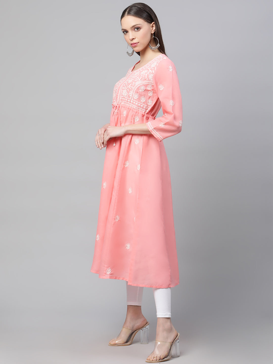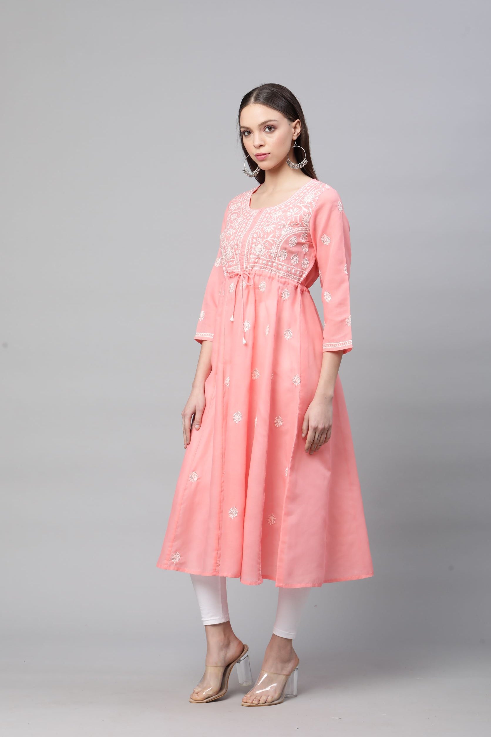 Pink Chikankari Flared Kurta with Waist Tie-Ups