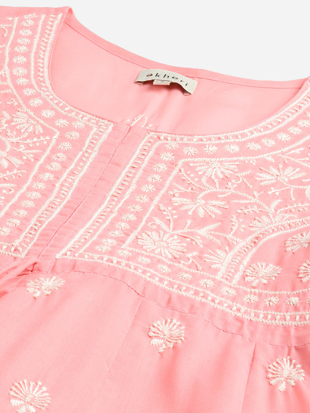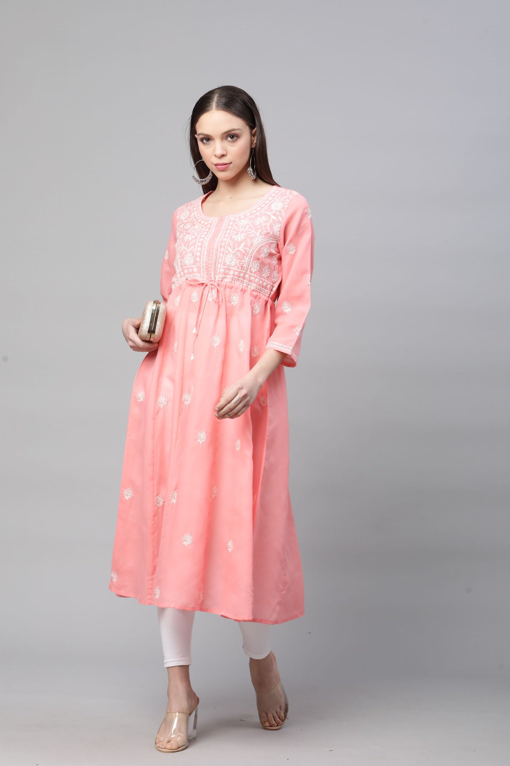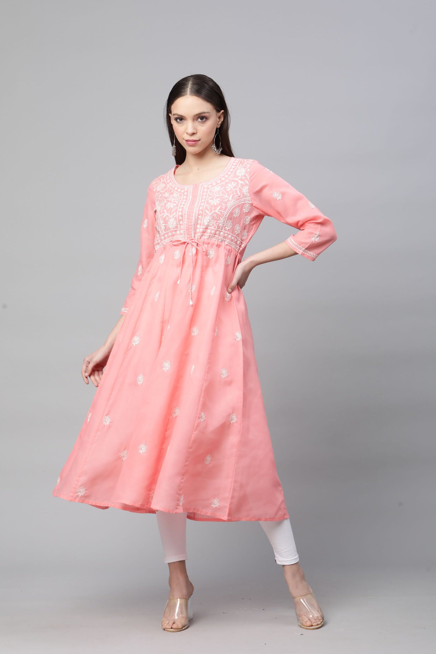 Pink Chikankari Flared Kurta with Waist Tie-Ups