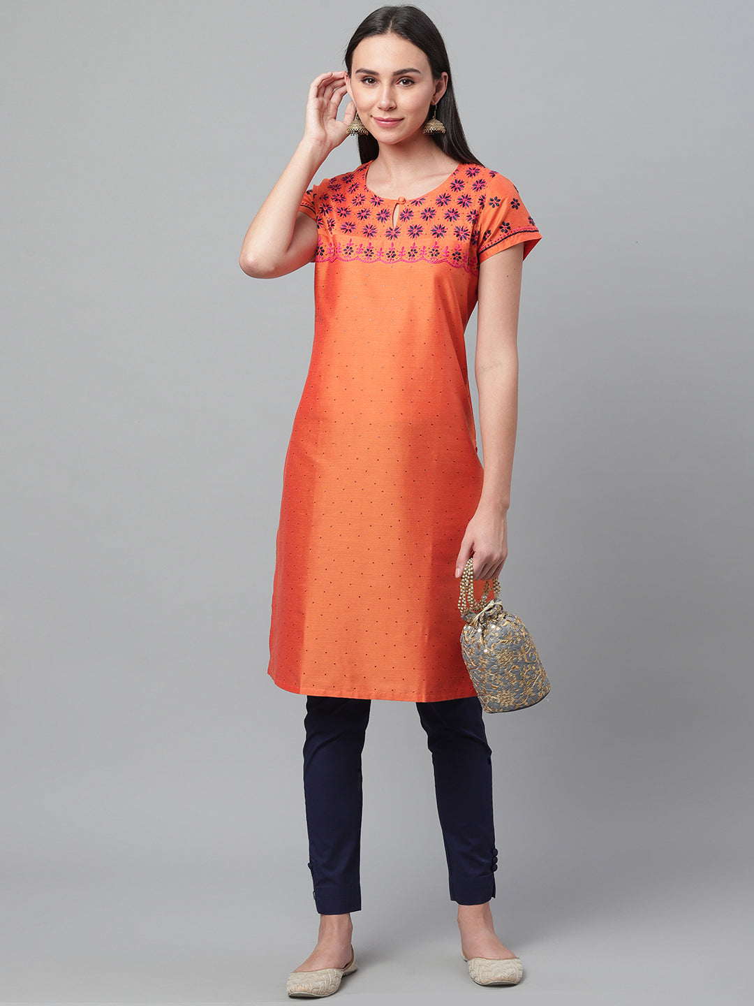 Orange Silk Kurta with Embroidery and Mukaish Work