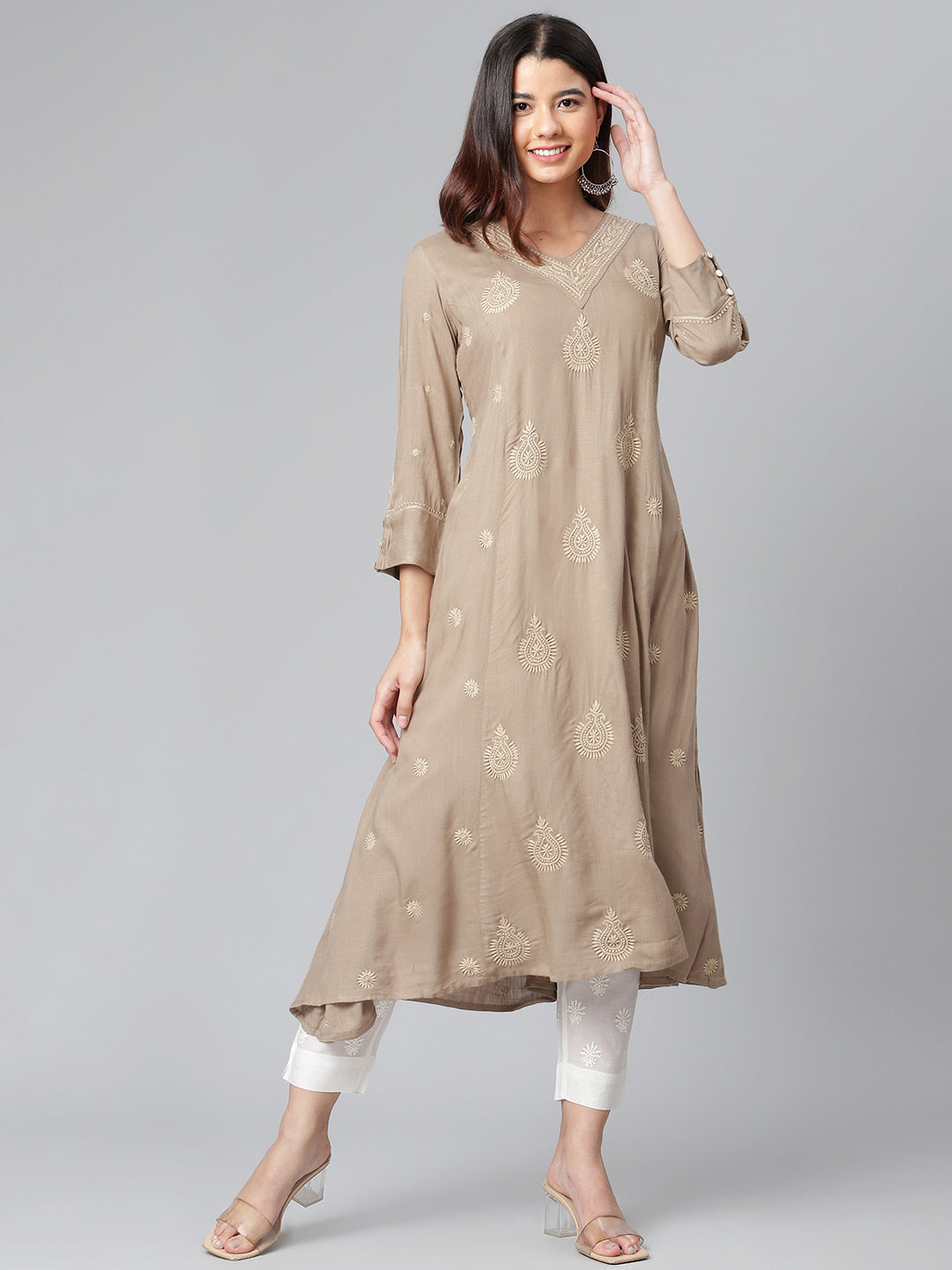 Rayon Chikankari Beige Flared Kurta