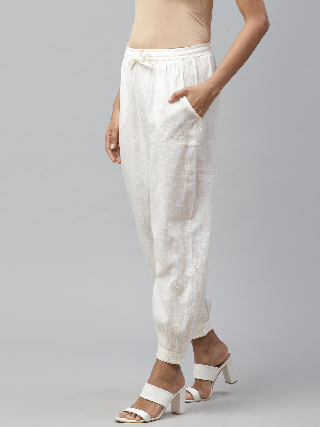 Off-white embroidered mid-rise Afghani pants, has elasticated waistband with drawstring closure, and 2 pockets