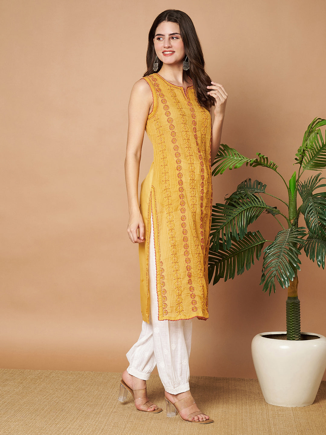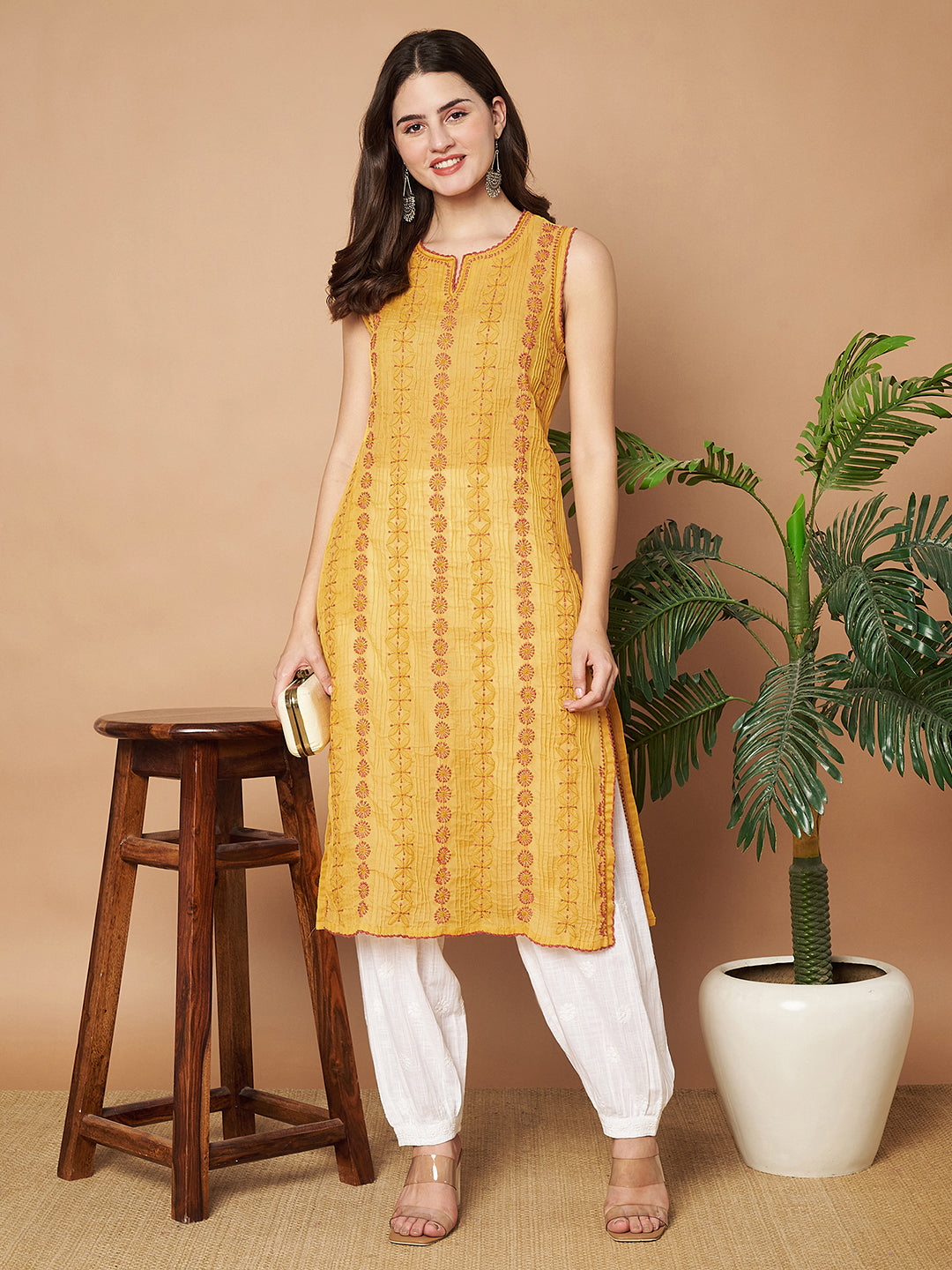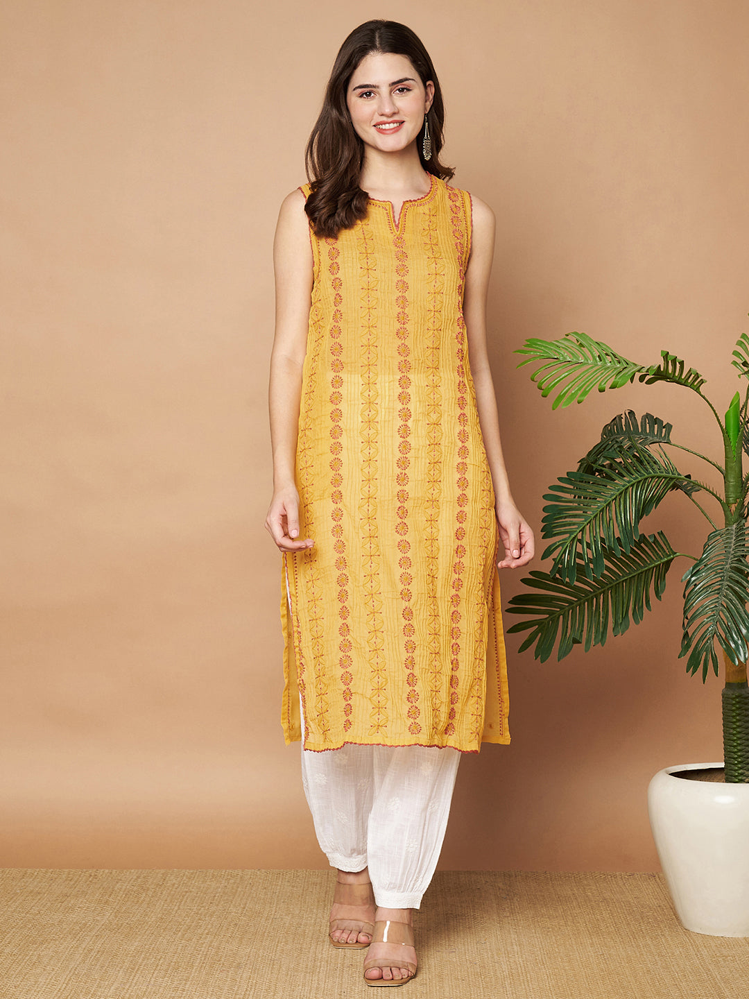 Chikankari is a traditional hand embroidery art form from Lucknow, India, involving intricate and delicate thread work on fine fabrics like cotton, georgette, or chiffon. Each piece is carefully hand-embroidered by skilled artisans, making it truly one-of-a-kind.