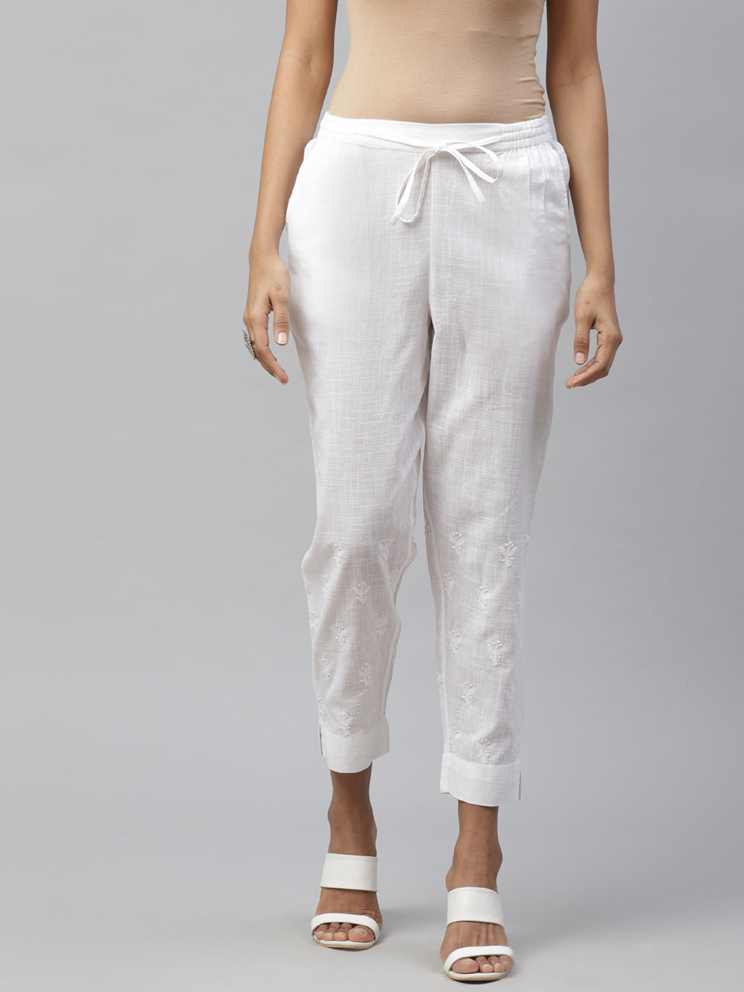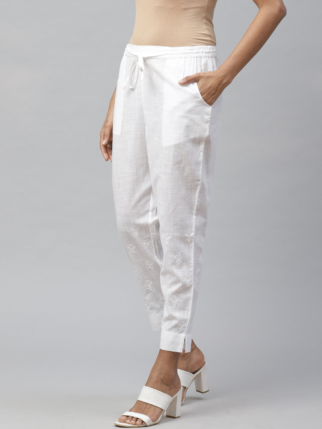 White solid mid-rise trousers with Chikankari embroidered detail, drawstring closure, and 2 pockets