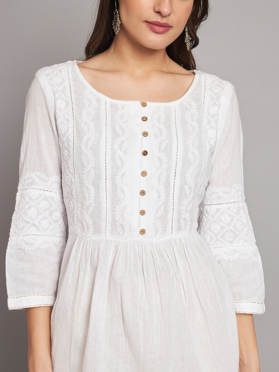 Introducing our white cotton hand-embroidered Chikankari top. The delicate floral motifs, intricate vines, and enchanting patterns adorn the fabric, reflecting the artistry and cultural heritage of this ancient craft. The white-on-white embroidery creates a subtle and sophisticated look that is both timeless and versatile.