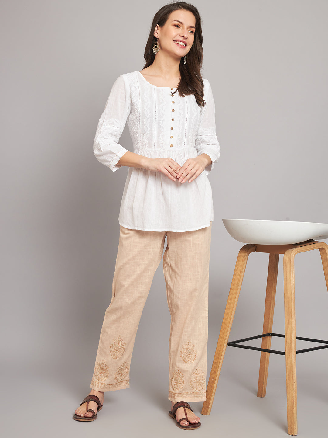 Pair it with a wrap skirt or straight pants for a casual look. Our Beige Chikankari Straight Pants are a good match for this one!