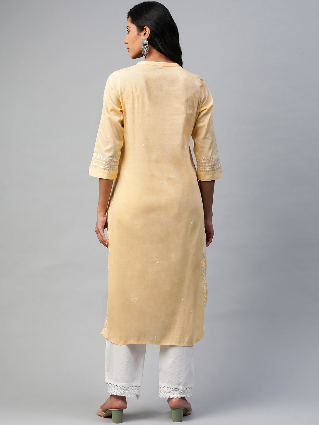 Yellow Self-Striped Kurta with Embroidered Yoke
